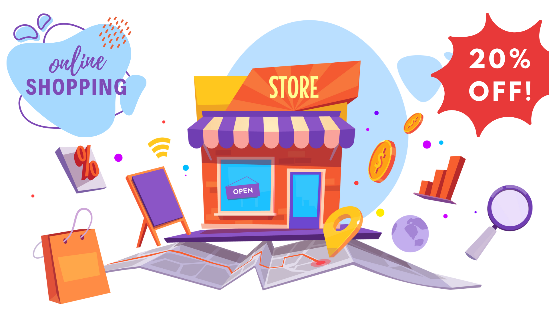 Blue Red Orange Cartoon Illustration Online Shopping Sale Announcement Banner (1920 x 1080 px)
